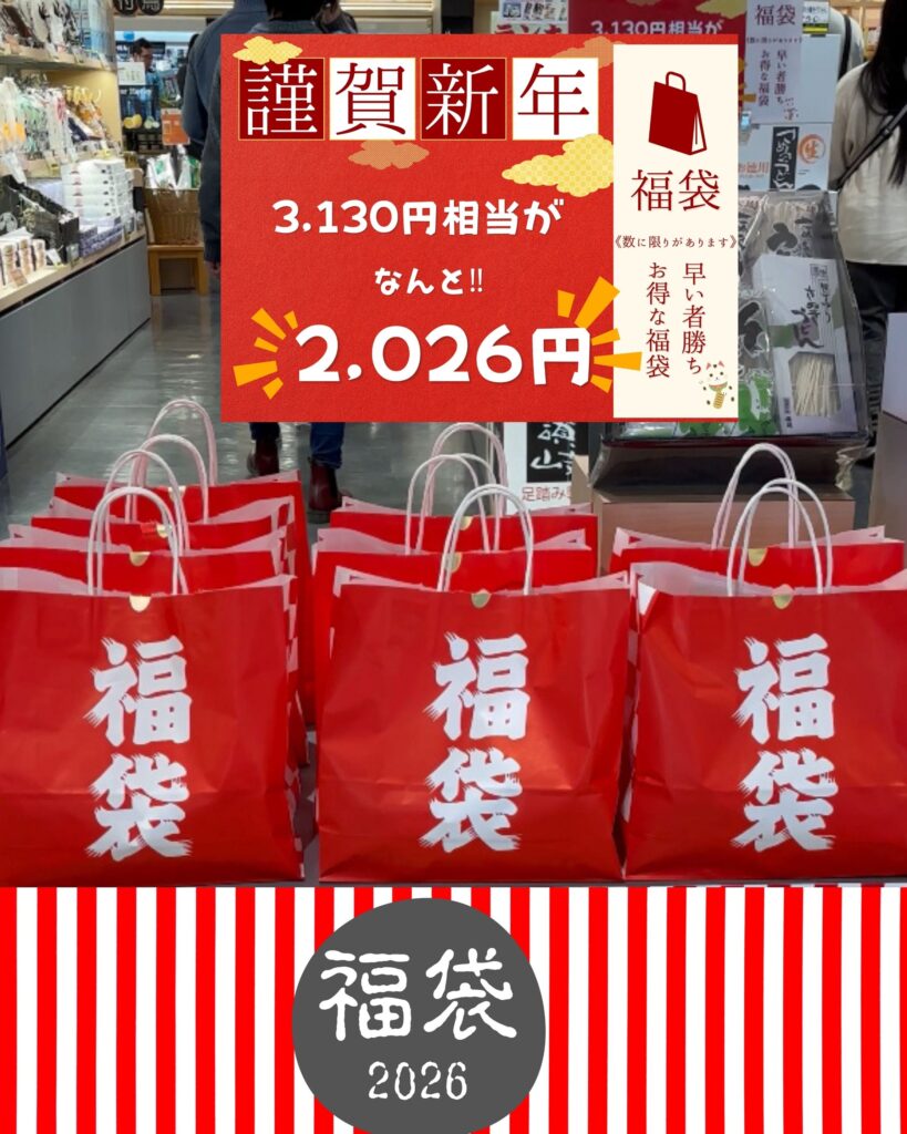 🎍お正月限定・福袋販売スタート🎍 2025.12.23 お土産・特産品スポット 3,130円相当がなんと!!2,026円😮‼️ 讃岐うどんとお蕎麦がセットになっていて!とてもお買い得!(^^)! ご自宅用にも、贈り物にもオススメです! よしまルシェ売店の入口にて販売中です🤗 このページをSNSでシェアする